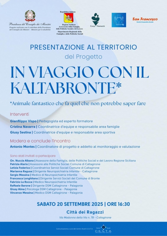 Sabato 20 settembre, presso la Città dei Ragazzi di Caltagirone, si è tenuta la presentazione del progetto “In viaggio con il Kaltabronte”, promosso dalle cooperative sociali Namastè e San Francesco.