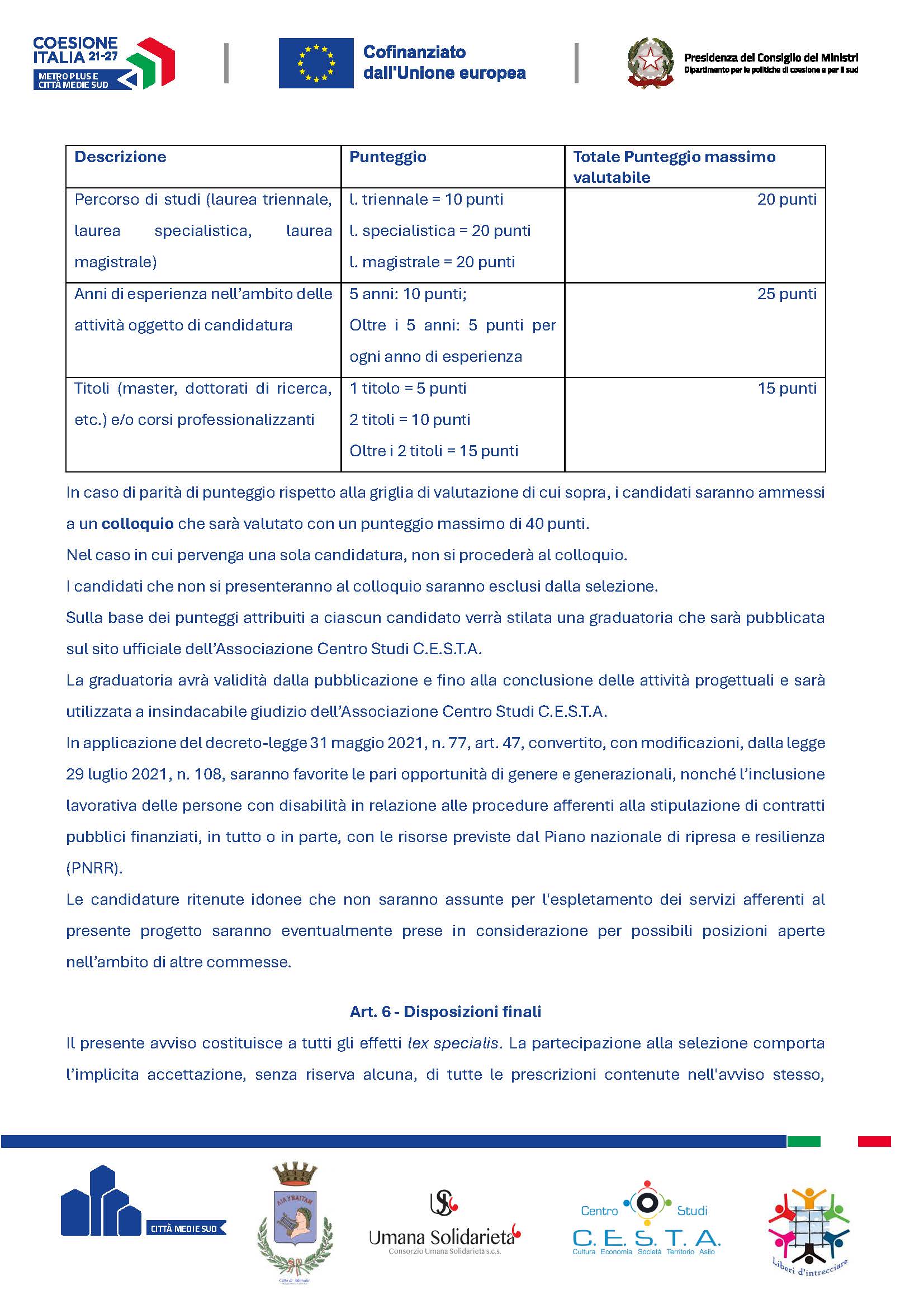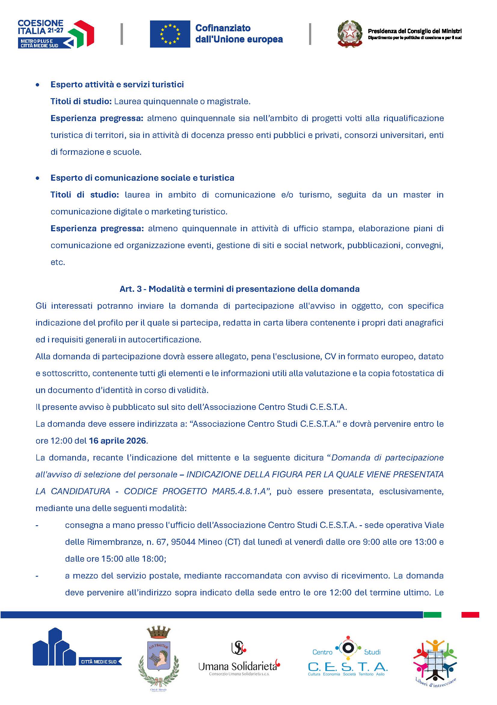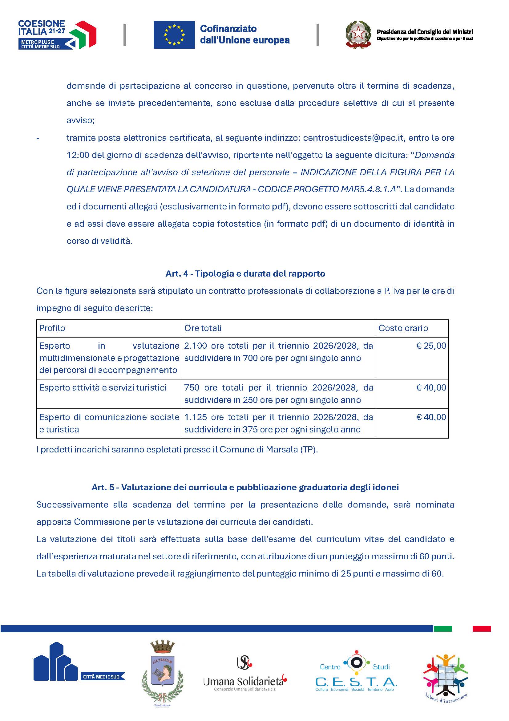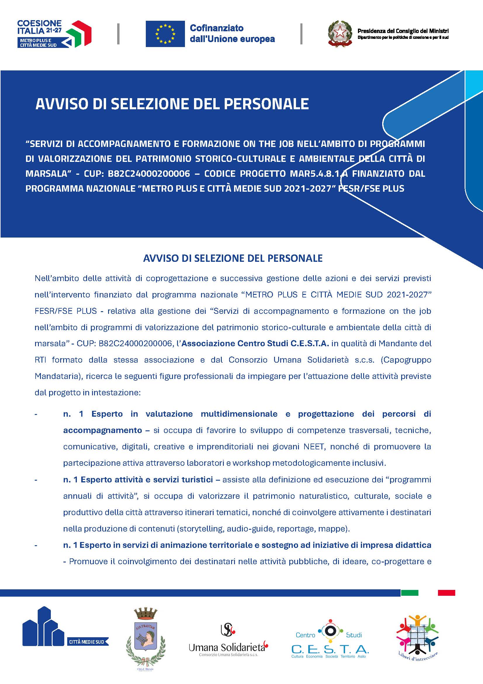 AVVISO DI SELEZIONE DEL PERSONALE “SERVIZI DI ACCOMPAGNAMENTO E FORMAZIONE ON THE JOB NELL’AMBITO DI PROGRAMMI DI VALORIZZAZIONE DEL PATRIMONIO STORICO-CULTURALE E AMBIENTALE DELLA CITTÀ DI MARSALA” - CUP: B82C24000200006 – CODICE PROGETTO MAR5.4
