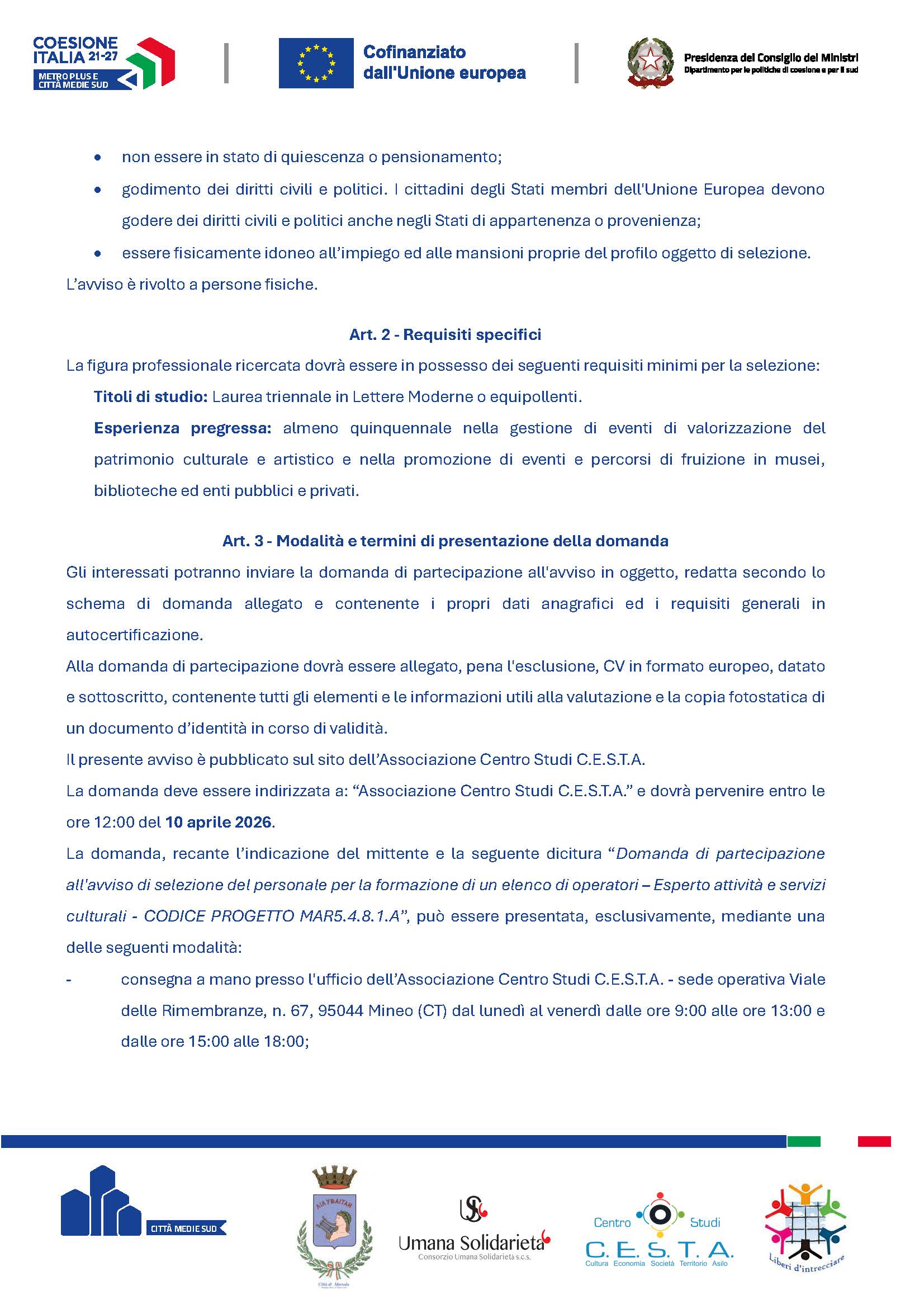AVVISO DI SELEZIONE DEL PERSONALE PER LA FORMAZIONE DI UN ELENCO DI OPERATORI “SERVIZI DI ACCOMPAGNAMENTO E FORMAZIONE ON THE JOB NELL’AMBITO DI PROGRAMMI DI VALORIZZAZIONE DEL PATRIMONIO STORICO-CULTURALE E AMBIENTALE DELLA CITTÀ DI MARSALA” – C